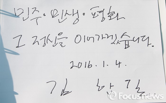 (서울=포커스뉴스) 김한길 무소속 의원이 4일 오전 서울 동작구 국립서울현충원 故 김대중 전 대통령 묘역을 찾아 참배를 마치고 방명록에 "민주·민생·평화 그 정신을 이어가겠습니다"라는 글귀를 남겼다.