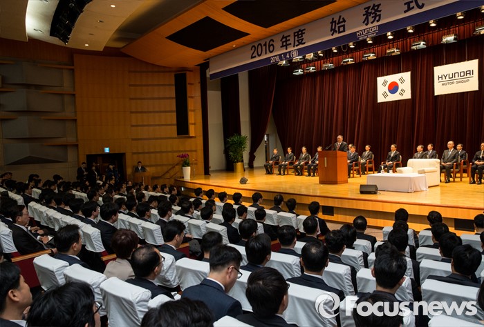 (서울=포커스뉴스) 4일 오전 서울 서초구 현대자동차 본사 대강당에서 열린 2016년도 시무식에 참석한 정몽구 현대차그룹 회장이 신년사를 하고 있다.