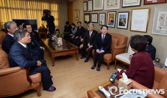 (서울=포커스뉴스) 신당 창당을 추진중인 무소속 안철수 의원 등이 4일 서울 동교동 고 김대중 전 대통령의 사저를 찾아 이희호 여사를 예방하고 새해 인사를 하고 있다.