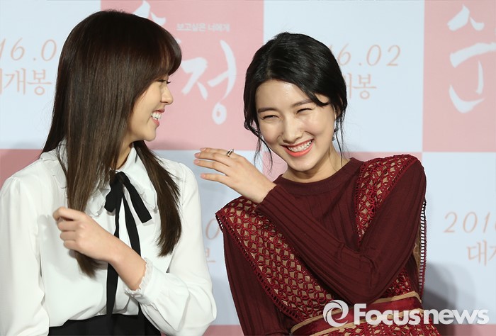 (서울=포커스뉴스) 4일 오전 서울 광진구 롯데시네마 건대입구점에서 열린 영화 '순정' 제작보고회에 참석한 배우 김소현(왼쪽)과 주다영이 미소를 짓고 있다.
