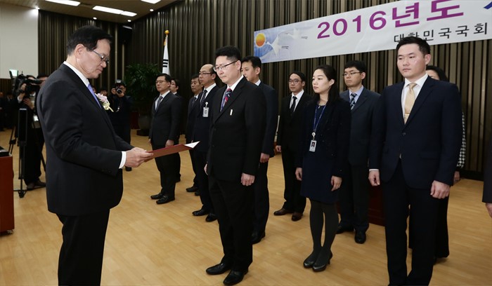 (서울=포커스뉴스) 정의화 국회의장이 4일 오전 서울 여의도 국회에서 열린 2016년 시무식에 참석해 우수직원들에게 시상하고 있다. <사진제공=국회>