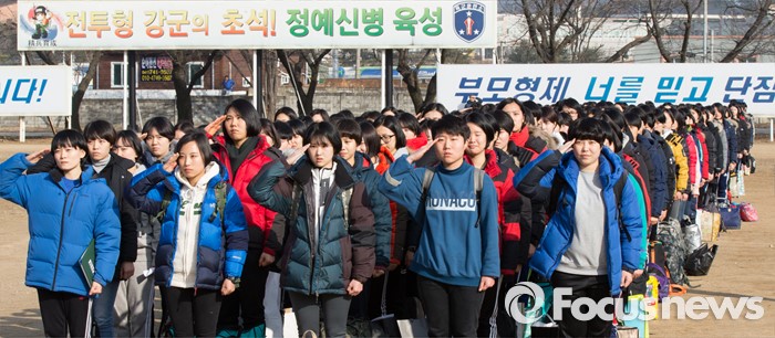 (논산=포커스뉴스) 4일 오후 충남 논산 육군훈련소 입영심사대에서 여군 부사관 후보생들이 거수경례를 하고 있다.
