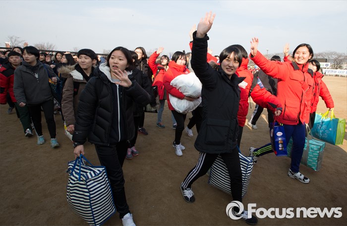 (논산=포커스뉴스) 4일 오후 충남 논산 육군훈련소 입영심사대에서 여군 부사솬후보생들이 가족들에게 인사하고 있다.