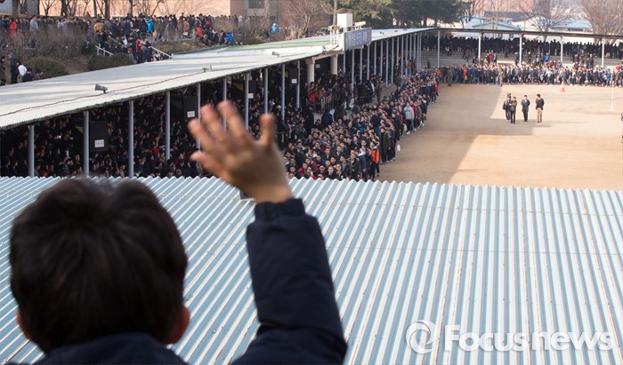 (논산=포커스뉴스) 4일 오후 충남 논산 육군훈련소 입영심사대에서 입영장병들이 가족과 인사하기 위해 연병장을 돌고 있다.