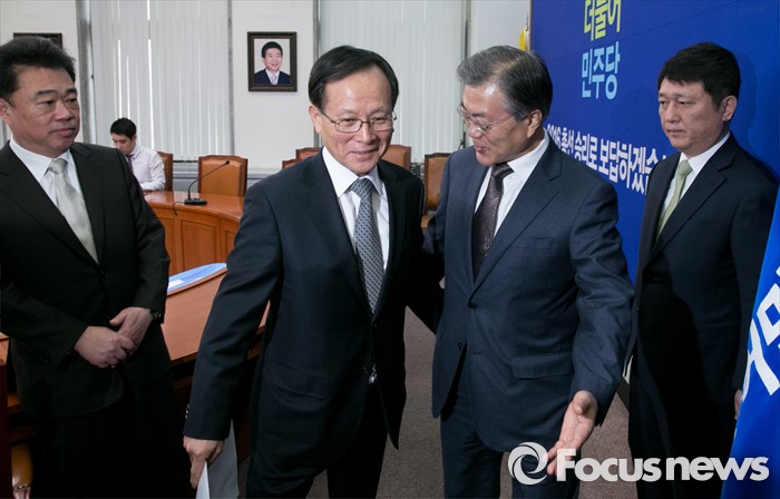 (서울=포커스뉴스) 문재인(오른쪽 두번째) 더불어민주당 대표가 5일 오전 서울 여의도 국회에서 이수혁(왼쪽 두번째) 전 6자회담 수석대표와 입당식을 마친 뒤 퇴장하고 있다.
