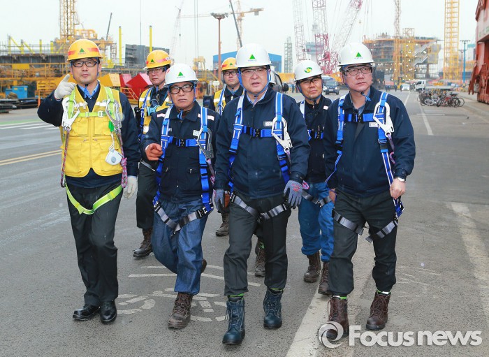 (서울=포커스뉴스) 현대중공업은 권오갑 사장과 백형록 노조위원장이 5일 울산조선소의 해양조립1공장 등 해양플랜트 제작 현장을 돌아보며 추운 날씨에 작업하는 직원들을 격려하고 현장의 목소리를 청취했다고 밝혔다.