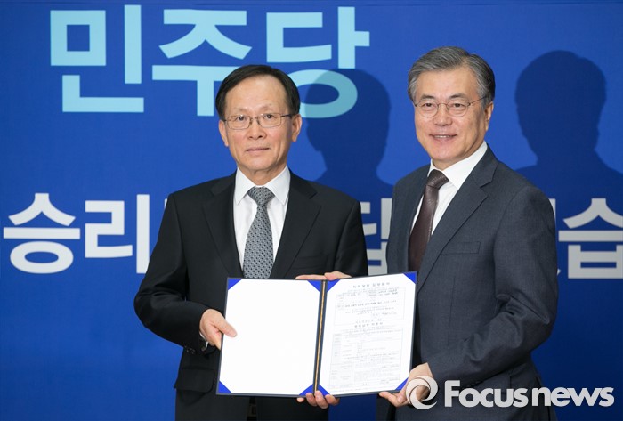 문 대표는 또 "이 전 수석은 북핵 문제 해결을 위한 다자외교의 틀을 만들고 북핵 문제 합의를 이끌어내는 데 핵심적인 역할을 하신 분"이라며 "우리 당이 추구하고 있는 통일을 실현하기 위해 통일·외교(분야)에서 중추계 역할을 할 것으로 기대한다"고 덧붙였다.