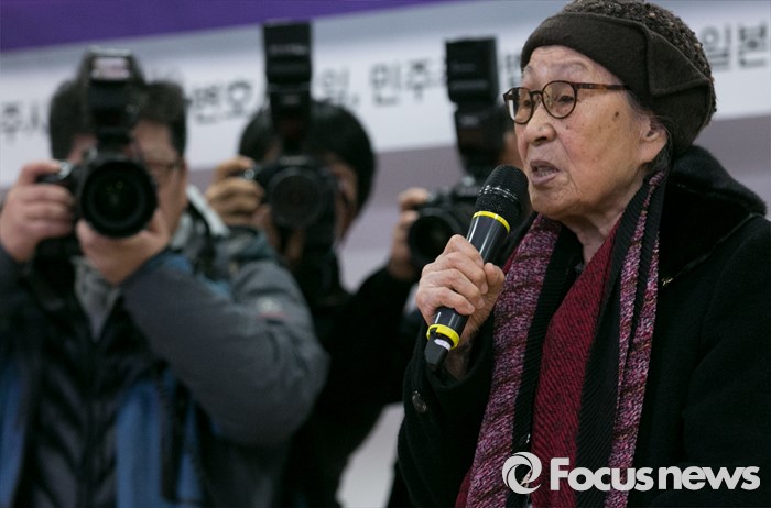 (서울=포커스뉴스) 5일 오후 서울 여의도 국회 의원회관에서 민주사회를 위한 변호사모임, 한국정신대문제대책협의회 등 주최로 열린 긴급진단, 2015년 한일 외교 장관 회담의 문제점 토론회에 참석한 위안부 피해자 김복동 할머니가 회담을 인정할 수 없는 이유에 대해 발언하고 있다.