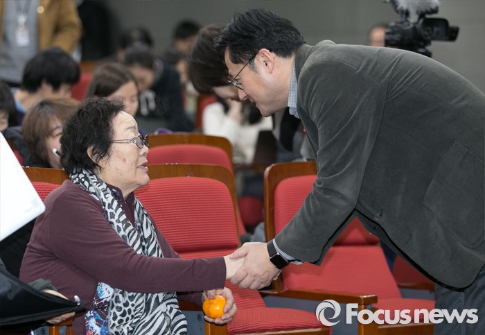 (서울=포커스뉴스) 5일 오후 서울 여의도 국회 의원회관에서 민주사회를 위한 변호사모임, 한국정신대문제대책협의회 등 주최로 열린 긴급진단, 2015년 한일 외교 장관 회담의 문제점 토론회에 참석한 더불어민주당 소속 홍익표(오른쪽) 여성가족위원회 일본군위안부문제대책소위원장과 위안부 피해자 이용수 할머니가 인사하고 있다.