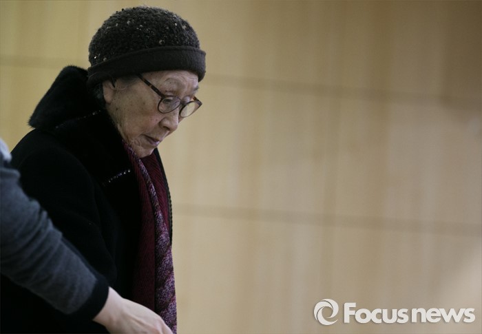 (서울=포커스뉴스) 5일 오후 서울 여의도 국회 의원회관에서 민주사회를 위한 변호사모임, 한국정신대문제대책협의회 등 주최로 열린 긴급진단, 2015년 한일 외교 장관 회담의 문제점 토론회에 참석한 위안부 피해자 김복동 할머니가 회담을 인정할 수 없는 이유에 대한 발언을 마친 뒤 단상에서 내려오고 있다.