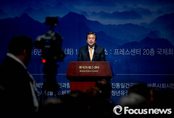 (서울=포커스뉴스) 김무성 새누리당 대표가 5일 오후 서울 중구 프레스센터에서 열린 ‘2016 시민사회 합동 신년회’에 참석, 참석자들을 향해 축사를 건내고 있다.