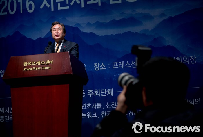 (서울=포커스뉴스) 김무성 새누리당 대표가 5일 오후 서울 중구 프레스센터에서 열린 ‘2016 시민사회 합동 신년회’에 참석, 참석자들을 향해 축사를 건내고 있다.