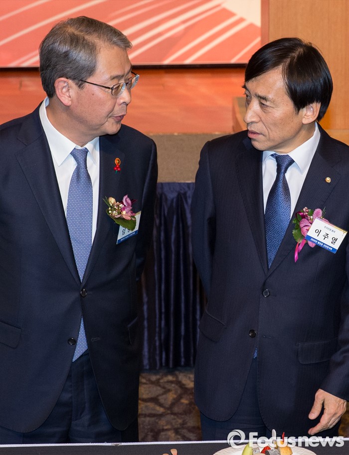 (서울=포커스뉴스) 5일 오후 서울 중구 롯데호텔에서 열린 '2016년 범금융 신년인사회'에 임종룡(왼쪽) 금융위원장과 이주열 한국은행 총재가 대화를 나누고 있다.