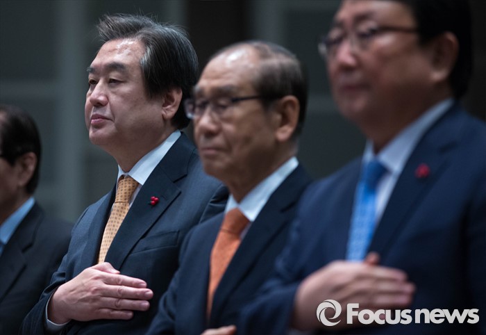 (서울=포커스뉴스) 김무성 새누리당 대표가 5일 오후 서울 중구 프레스센터에서 열린 ‘2016 시민사회 합동 신년회’에 참석, 행사에 앞서 국민의례를 하고 있다.