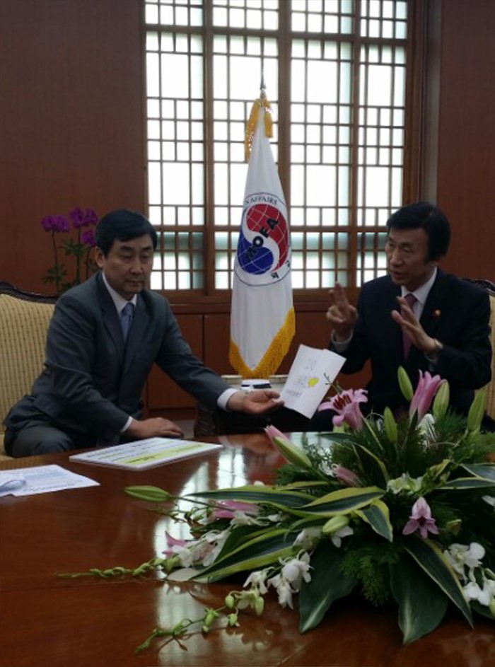 (서울=포커스뉴스) 이종걸(왼쪽) 더불어민주당 원내대표가 5일 오후 서울 종로구 정부서울청사 외교부를 한일 위안부 합의와 관련 항의 방문해 윤병세 장관과 대화하고 있다. <사진제공=더불어민주당>