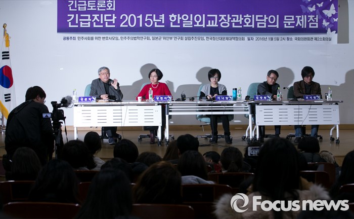 한편 이날 홍익표 더불어민주당 의원, 김제남 정의당 의원 등도 참석해 "이번 협상을 백지화하고 재협상해 줄 것을 정부에 요청한다"고 밝혔다.5일 오후 서울 여의도 국회 의원회관에서 민주사회를 위한 변호사모임, 한국정신대문제대책협의회 등 주최로 열린 '긴급진단, 2015년 한일외교장관회담의 문제점' 토론회에 참석한 패널들이 토론을 하고 있다. 왼쪽부터 장완익 변호사, 양현아 서울대 법학과 교수, 이나영 중앙대 사회학과 교수, 김창록 경북대 법학과 교수, 조시현 전 건국대 법학과 교수. 박동욱 기자 5일 오후 서울 여의도 국회의원회관에서 민주사회를 위한 변호사모임, 한국정신대문제대책협의회 등 주최로 열린 '긴급진단, 2015년 한일외교장관회담의 문제점' 토론회에 참석한 위안부 피해자 김복동 할머니가 회담을 인정할 수 없는 이유에 대해 발언하고 있다. 뒤로 태극기가 보인다. 박동욱 기자