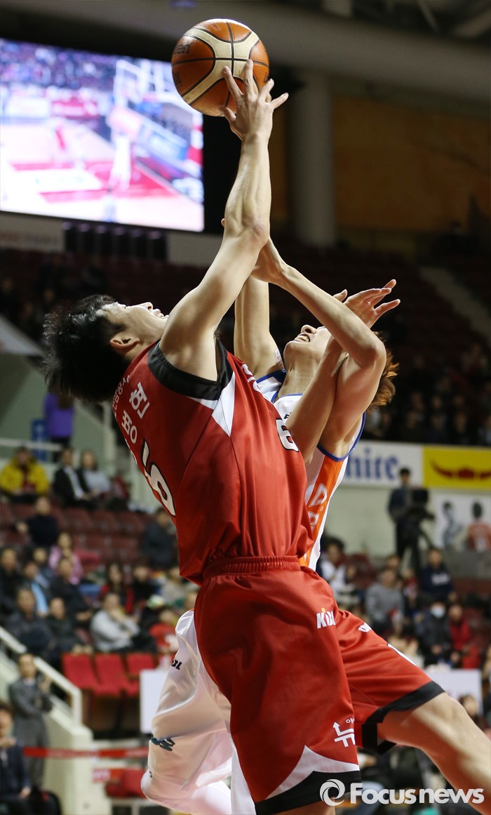 (안양=포커스뉴스) 5일 안양실내체육관에서 열린 2015-2016 프로농구 KGC-전자랜드 경기에서 KGC 정병현과 전자랜드 정휘량이 리바운드 다툼을 하고 있다.