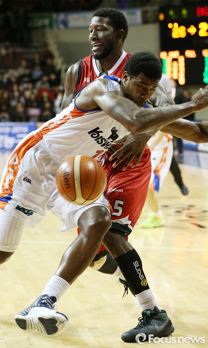(안양=포커스뉴스) 5일 안양실내체육관에서 열린 2015-2016 프로농구 KGC-전자랜드 경기에서 전자랜드 포웰이 KGC 마리오 리틀의 패스 동작때 몸을 던지며 차단하고 있다.