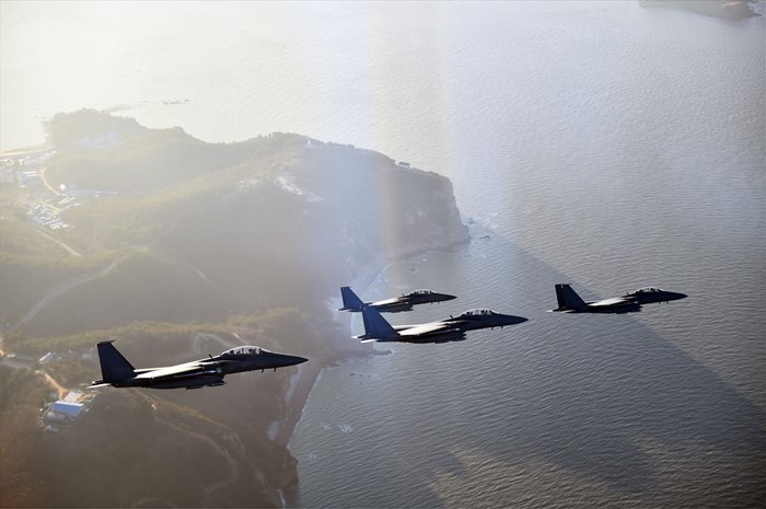 (서울=포커스뉴스) 공군 F-15K 편대가 서해 최북단 영토인 연평도 상공을 초계비행하고 있다. <사진제공=공군>