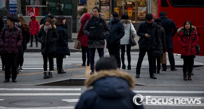(서울=포커스뉴스) 절기상 소한(小寒)인 6일 오전 서울 강남역 인근에서 직장인들이 영하권 강추위에 두꺼운 외투를 입고 신호를 기다리고 있다.