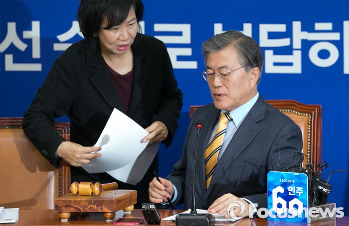 (서울=포커스뉴스) 문재인(왼쪽) 더불어민주당 대표와 손혜원 홍보위원장이 6일 오전 서울 여의도 국회에서 열린 최고위원회의에 참석해 대화하고 있다.