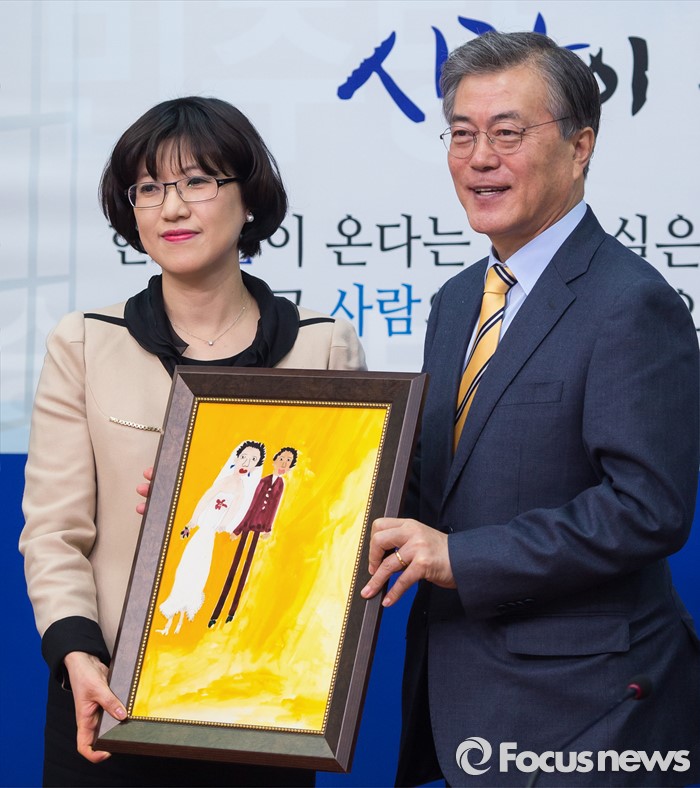 (서울=포커스뉴스) 문재인(오른쪽) 더불어민주당 대표가 6일 오전 서울 여의도 국회에서 열린 김선현 세계미술치료학회장 입당식에 참석해 김 학회장으로 입당원서 대신 그림을 전달받고 있다.