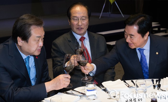 (서울=포커스뉴스) 김무성(왼쪽) 새누리당 대표, 신경식(가운데) 대한민국헌정회 회장, 이석현(오른쪽) 국회 부의장이 6일 오전 서울 영등포구 글래드호텔에서 열린 대한민국 헌정회 신년인사모임에 참석해 건배를 하고 있다.
