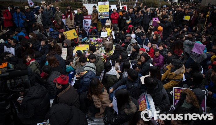 (서울=포커스뉴스) 일본군 위안부 문제해결을 위한 정기수요집회가 제1212차로 24주년을 맞은 6일 오후 서울 종로구 구 일본대사관 앞에서 참가자들이 손피켓을 들고 있다.