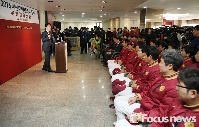 (서울=포커스뉴스) 6일 목동구장에서 열린 프로야구 2016 넥센 히어로즈 시무식에서 이장석 대표가 인삿말을 하고 있다.