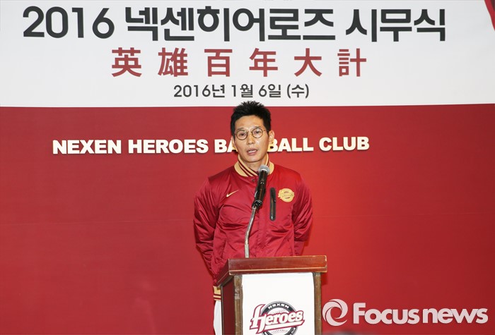 (서울=포커스뉴스) 6일 목동구장에서 열린 프로야구 2016 넥센 히어로즈 시무식에서 염경엽 감독이 새해의 선전을 다짐하는 인삿말을 하고 있다.
