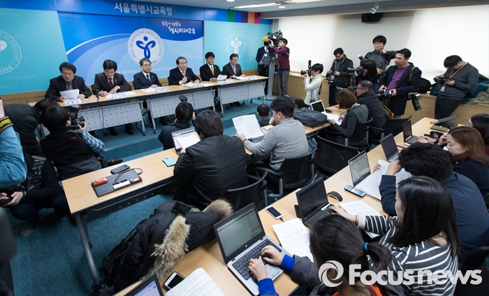 (서울=포커스뉴스) 6일 오후 서울 종로구 서울특별시교육청에서 장휘국(오른쪽 세번째) 광주시 교육감이 정부의 누리과정 예산 미편성 시 강력 대처 발표와 관련해 긴급 기자회견을 하고 있다. 왼쪽부터 조희연 서울시 교육감, 김승환 전라북도 교육감, 이재정 경기도 교육감, 장휘국 광주시 교육감, 이청연 인천시 교육감, 민병희 강원도 교육감.