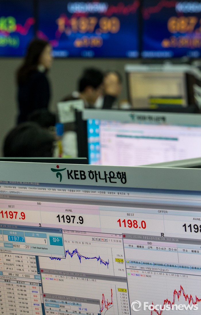 (서울=포커스뉴스) 코스피 지수가 전거래일 보다 5.10포인트(0.26%) 하락한 1,925.43에 거래를 마치며, 북한의 수소탄 실험에도 1920선을 지킨 6일 오후 서울 중구 KEB하나은행 본점 딜링룸에서 딜러들이 업무를 보고 있다. 이날 원달러 환율은 전거래일 보다 9.9원 오른 1197.9원에 마감하며, 지난해 9월 1200.9원 이후 4개월 만에 최고치를 기록 했다.
