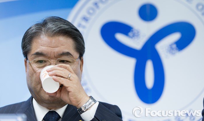 (서울=포커스뉴스) 6일 오후 서울 종로구 서울특별시교육청에서 이재성 경기도 교육감이 정부의 누리과정 예산 미편성 시 강력 대처 발표 관련 긴급 기자회견에서 물을 마시고 있다.