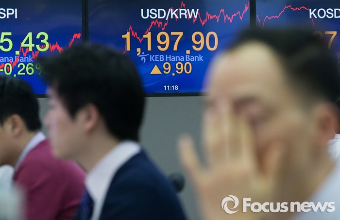 (서울=포커스뉴스) 코스피 지수가 전거래일 보다 5.10포인트(0.26%) 하락한 1,925.43에 거래를 마치며, 북한의 수소탄 실험에도 1920선을 지킨 6일 오후 서울 중구 KEB하나은행 본점 딜링룸에서 딜러들이 업무를 보고 있다. 이날 원달러 환율은 전거래일 보다 9.9원 오른 1197.9원에 마감하며, 지난해 9월 1200.9원 이후 4개월 만에 최고치를 기록 했다.