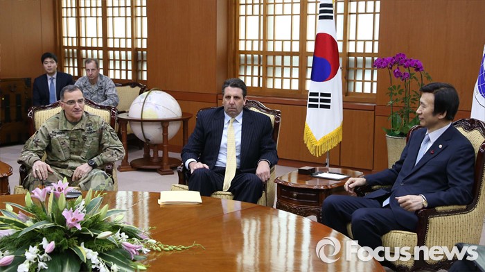 (서울=포커스뉴스) 북한이 첫 수소탄 핵실험을 실시했다고 발표한 6일 오후 서울 종로구 외교부청사에서 커티스 스캐퍼로티(왼쪽부터) 한미연합사령관과 마크 리퍼트 주한 미대사, 윤병세 외교부 장관이 대화하고 있다.