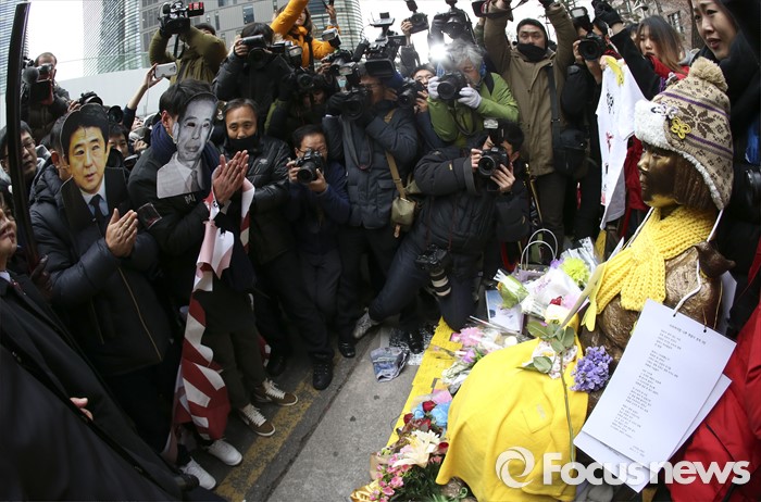 (서울=포커스뉴스) 6일 오후 서울 종로구 주한일본대사관 앞에서 아베 총리와 그의 외할아버지 기시 노부스케의 가면을 쓴 어버이연합 회원들이 소녀상을 향해 사과하는 퍼포먼스를 하고 있다.