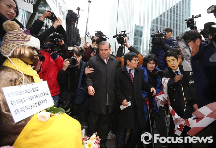 (서울=포커스뉴스) 6일 오후 서울 종로구 주한일본대사관 앞에서 아베 총리와 그의 외할아버지 기시 노부스케의 가면을 쓴 어버이연합 회원들이 소녀상을 향해 사과하는 퍼포먼스를 하고 있다.