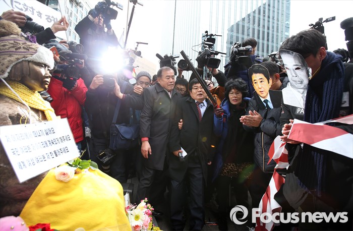 (서울=포커스뉴스) 6일 오후 서울 종로구 주한일본대사관 앞에서 아베 총리와 그의 외할아버지 기시 노부스케의 가면을 쓴 어버이연합 회원들이 소녀상을 향해 사과하는 퍼포먼스를 하고 있다.