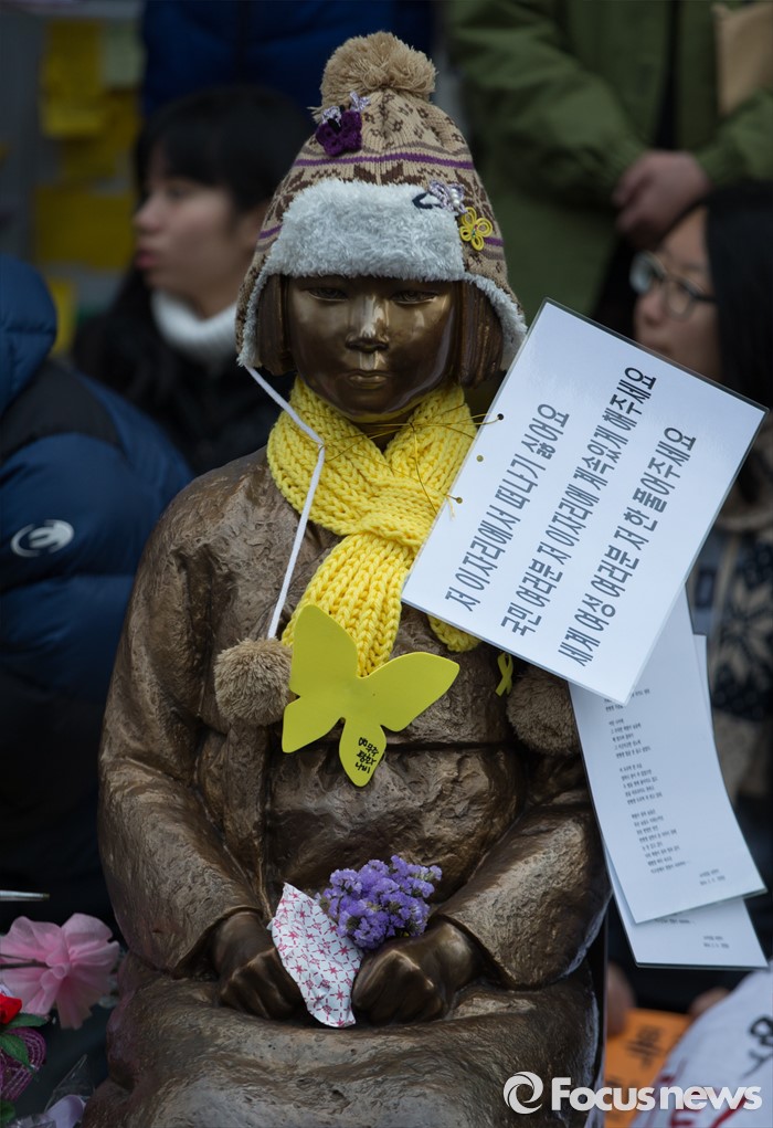 (서울=포커스뉴스) 6일 오후 서울 종로구 위안부 소녀상 앞에서 올해로 24주년을 맞은 일본군 위안부 문제 해결을 위한 1212차 수요 시위가 열리고 있다.