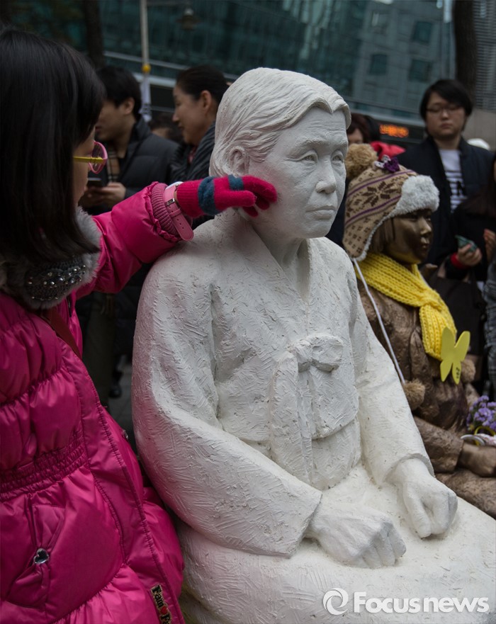 (서울=포커스뉴스) 6일 오후 서울 종로구 위안부 소녀상 앞에서 올해로 24주년을 맞은 일본군 위안부 문제 해결을 위한 1212차 수요 시위가 열리고 있다. 한 소녀가 김학순 할머니 동상을 어루만지고 있다.