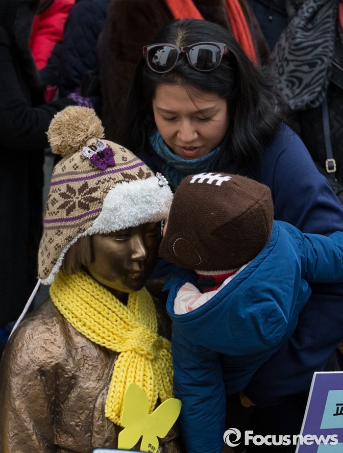(서울=포커스뉴스) 6일 오후 서울 종로구 위안부 소녀상 앞에서 올해로 24주년을 맞은 일본군 위안부 문제 해결을 위한 1212차 수요 시위가 열리고 있는 가운데 한 아이가 소녀상에게 입 맞추고 있다.