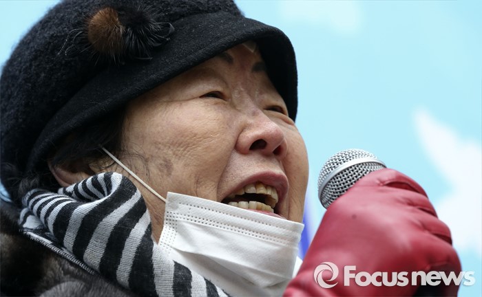 (서울=포커스뉴스) 일본군 위안부 문제 해결을 위한 정기 수요집회 24주년인 6일 오후 서울 종로구 주한일본대사관 앞 소녀상 주변에서 열린 집회에서 이용수 할머니가 발언을 하고 있다.