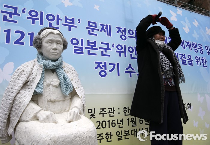 (서울=포커스뉴스) 6일 서울 종로구 옛 일본대사관 앞에서 열린 제1212차 정기수요집회에서 이용수 할머니가 발언 후 참석자들에게 하트를 만들어 보이고 있다. 옆은 김학순 할머니 석상. 단일 주제로 벌이는 세계 최장기 집회로 알려진 정기수요집회는 1992년 1월 8일 시작해 금일로 24주년을 맞이했다.