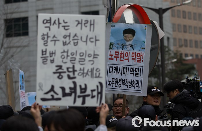 (서울=포커스뉴스) 6일 오후 서울 종로구 중학동 일본대사관 앞에서 열리는 일본군 위안부 문제 해결을 위한 수요시위가 24주년을 맞이한 가운데 어버이연합 및 보수단체 회원들과 수요집회 참석자들이 서로 대치하고 있다.