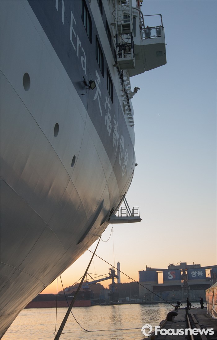 (동해=포커스뉴스) 7일 오전 강원 동해항 중앙부두에 중국 천해크루즈사의 스카이씨 골든 에라호가 승객 1천800여 명을 싣고 입항하고 있다. 이날 강원도를 찾은 관광객 1천800여 명은 정선 강원랜드 눈썰매장, 평창 용평·알펜시아스키장, 속초 중앙시장, 설악산 등을 둘러볼 예정이다.