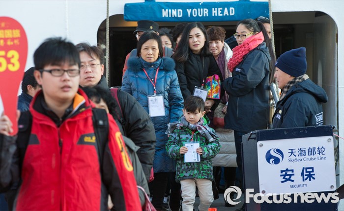 (동해=포커스뉴스) 7일 오전 강원 동해항 중앙부두에 입항한 중국 천해크루즈사의 스카이씨 골든 에라호에서 중국인 관광객들이 하선하고 있다. 이날 강원도를 찾은 관광객 1천800여 명은 정선 강원랜드 눈썰매장, 평창 용평·알펜시아스키장, 속초 중앙시장, 설악산 등을 둘러볼 예정이다.