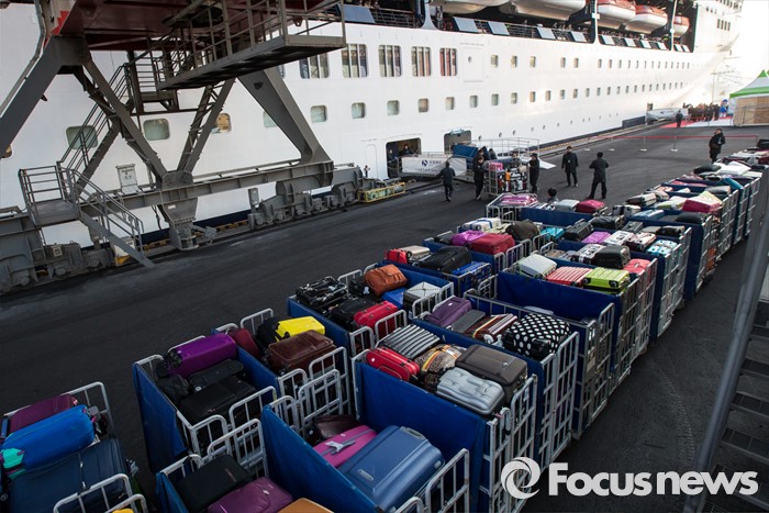 (동해=포커스뉴스) 7일 오전 강원 동해항 중앙부두에 입항한 중국 천해크루즈사의 스카이씨 골든 에라호에서 직원들이 관광객들의 짐을 내리고 있다. 이날 강원도를 찾은 관광객 1천800여 명은 정선 강원랜드 눈썰매장, 평창 용평·알펜시아스키장, 속초 중앙시장, 설악산 등을 둘러볼 예정이다.
