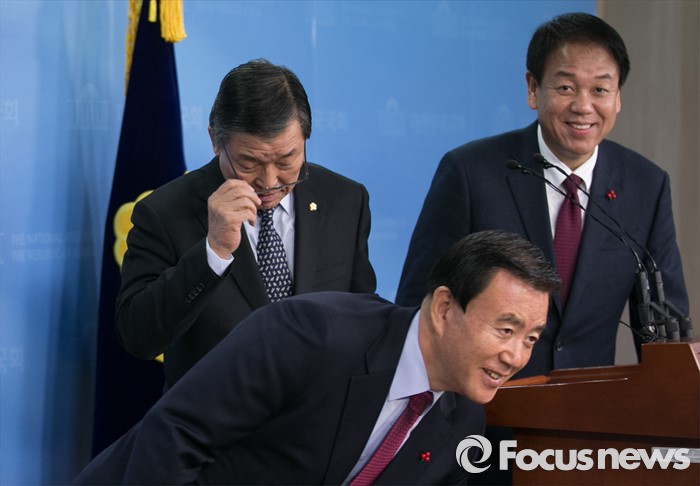 (서울=포커스뉴스) 황진하 새누리당 공천제도특별위원장이 7일 오전 서울 여의도 국회 정론관에서 특위 회의 결과에 대한 브리핑을 마친 뒤 퇴장하고 있다. 왼쪽부터 황 위원장, 홍문표 의원, 박종희 제2사무부총장.