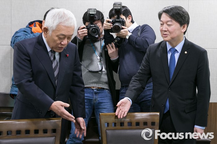 (서울=포커스뉴스) 더불어민주당을 탈당한 김한길, 안철수 의원이 7일 오후 서울 여의도 국회 의원회관 의원식당에서 오찬 회동을 위해 만나, 자리하고 있다.