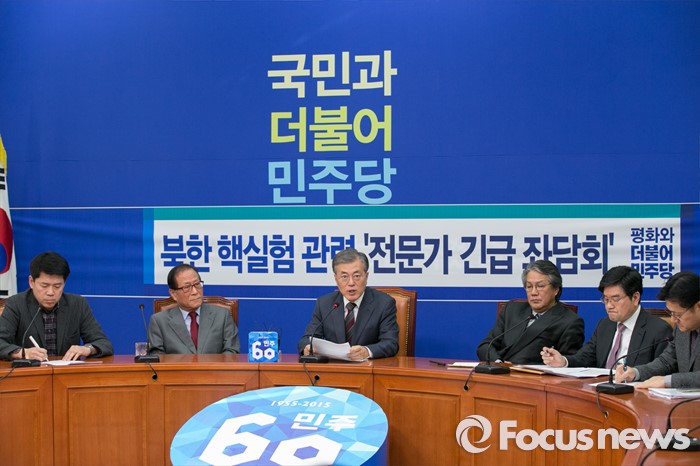 (서울=포커스뉴스) 문재인(왼쪽 세번째) 더불어민주당 대표가 7일 오후 서울 여의도 국회에서 열린 '북한 핵실험 관련 전문가 긴급 좌담회'를 주재하고 있다.